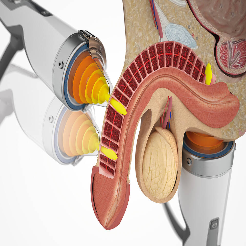 Die extrakorporale Stoßwellentherapie (ESWT) ist ein nicht-invasiver Ansatz, bei dem niedrigenergetische Schallwellen gezielt auf den Penis gerichtet werden, um neue Blutgefäße zu stimulieren und die Durchblutung zu verbessern.